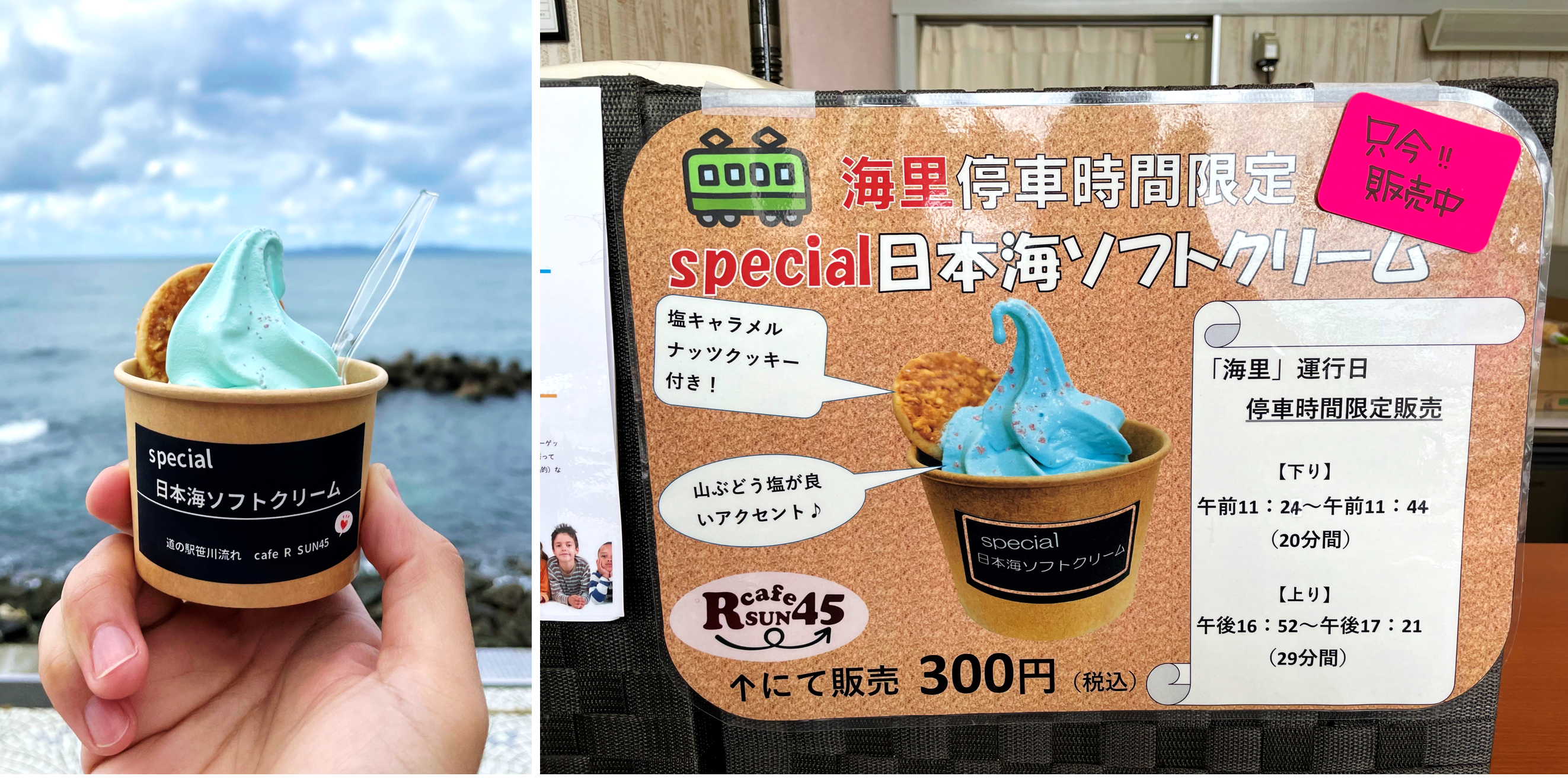 You may have seen all kinds of ice cream, but what about one inspired by the Sea of Japan? At JR Kuwagawa Station, they got to enjoy the Sea of Japan soft-served ice cream (日本海ソフトクリーム Nihon-kai sofuto kurīmu)! This specially-made ice cream is exclusively for passengers of the KAIRI, and is available only at 11:24–11:44 and 16:52–17:21 on the days when the KAIRI is running (the times vary according to the train arrival). That’s right, it’s exclusively for KAIRI passengers, so imagine how lucky Jak and Emmie were to get their hands on this.