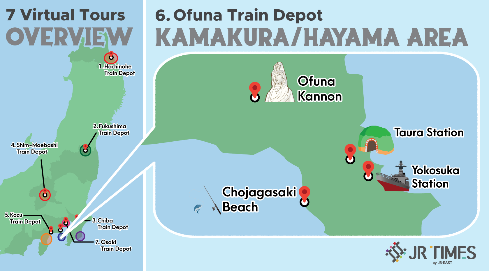 Therefore in this article, we will be introducing the areas which we were planning to showcase in our virtual tour: Ofuna (大船), Hayama (葉山), Taura (田浦) and Yokosuka (横須賀). In addition to these areas, our depot is also in charge of three different railway lines, taking passengers to the airport and urban cities like Tokyo and Shinjuku everyday.