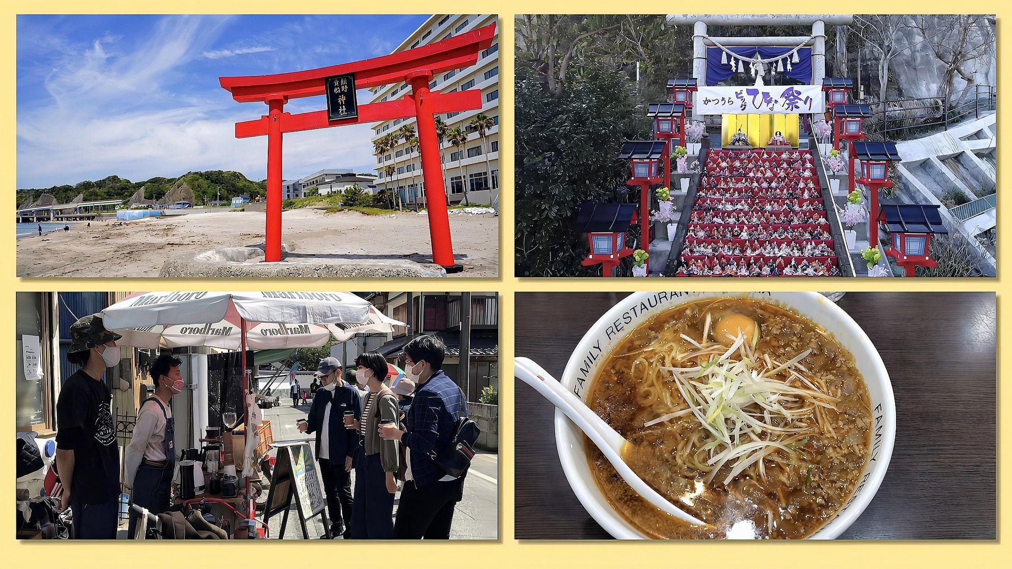 When it gets dark, lanterns are lit at Tomisaki Shrine (遠見岬神社 Tomisaki-jinja), which is near the morning market. During the Katsuura Big Hinamatsuri festival (かつうらビッグひな祭り), as many as 1,800 hina dolls are lined up on the stairs of Tomisaki Shrine. At the top of the stairs is a spectacular spot with a panoramic view of Katsura City and the gorgeous sea.