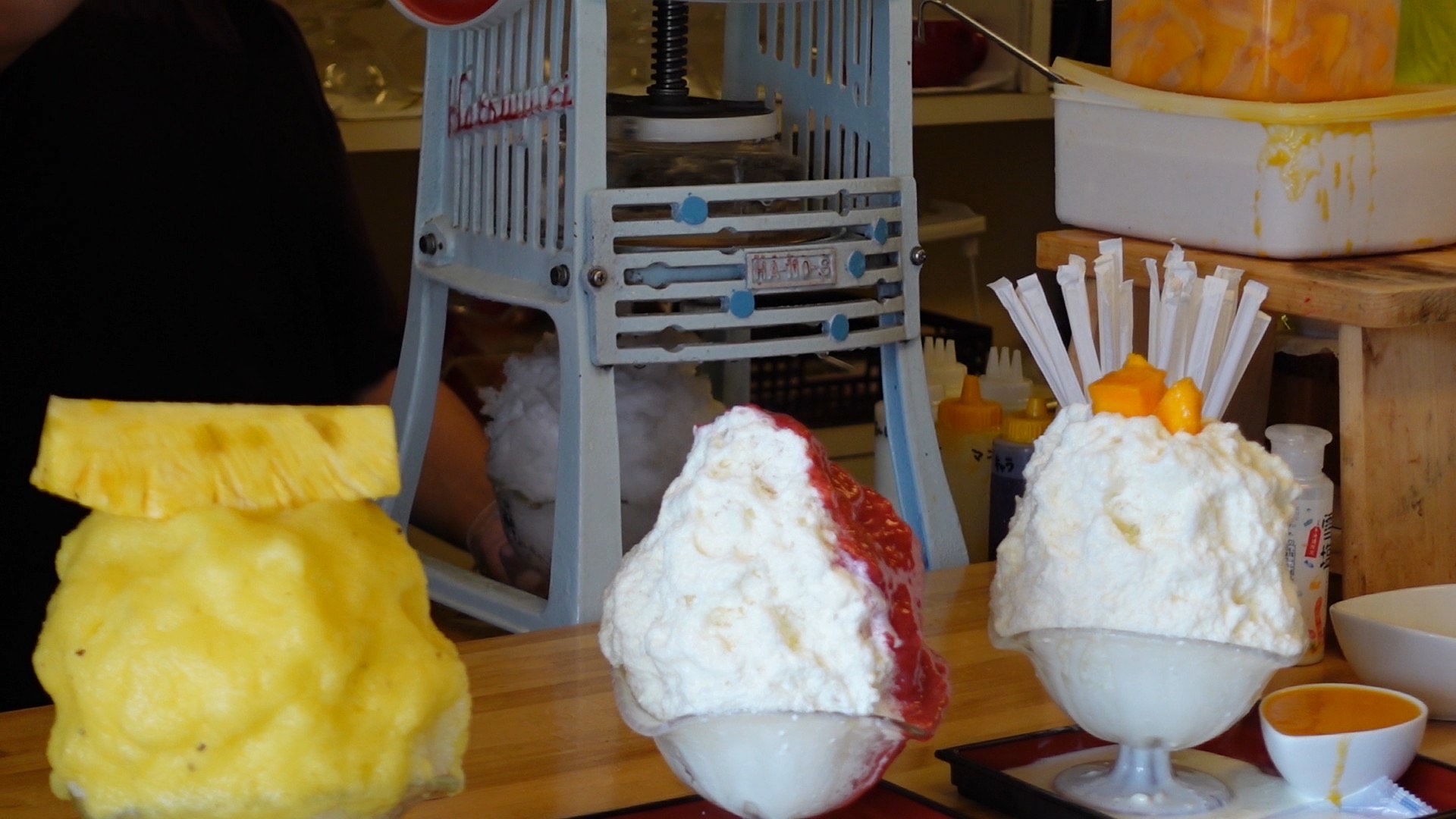 It’s super hot today! Eating kakigori (かき氷 Japanese shaved ice) is the one of the best ways to cool down on such a day. One of the most famous kakigori shops in Tokyo is found at the Yanaka Ginza Shopping Street (谷中銀座商店街 Yanaka Ginza shōtengai). Koi-chan is enjoying his shaved ice. It’s so huge!