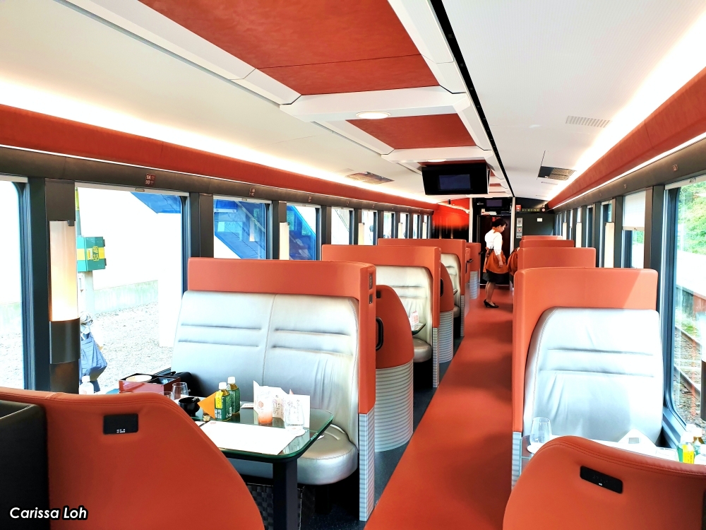 Car 1 seats 30 people, and features regular two by two seats, all of which have ample leg room, a padded orange head rest, and can be reclined. Windows are large and wide for you to enjoy the passing scenery of the sapphire sea and golden rice fields in autumn.