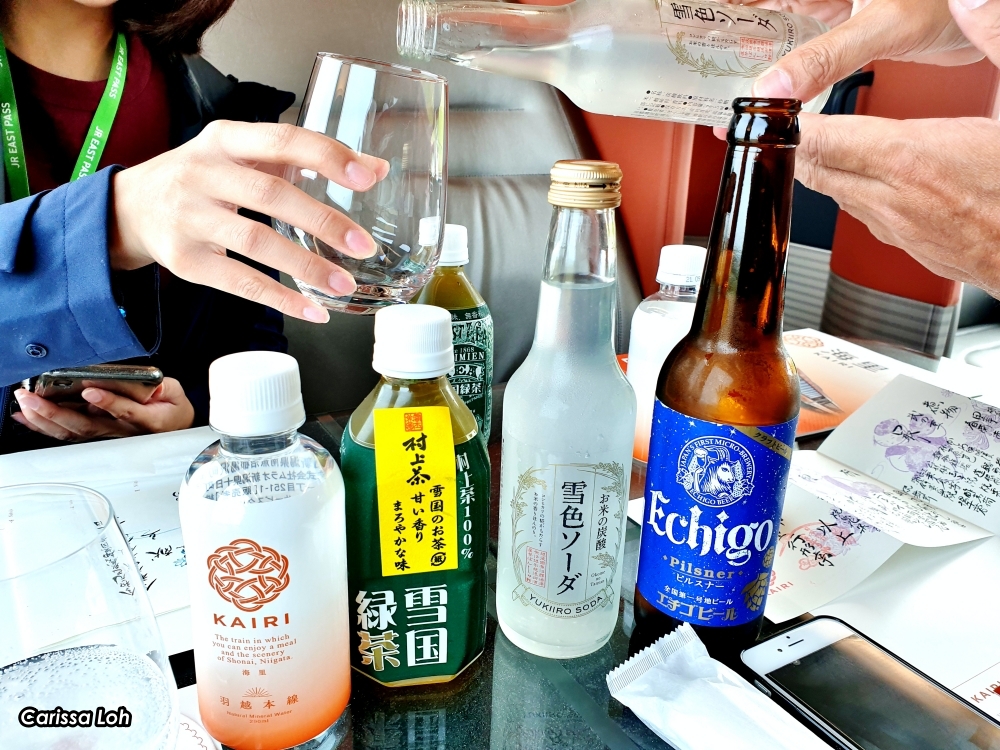 Before boarding the train, don’t miss your chance to take a photo with the friendly train staff and welcome banner at the platform at JR Niigata Station. The banner welcomes you on a gastronomic journey along the Sea of Japan (日本海美食旅 Nihonkai Bishoku Tabi). The KAIRI was created in conjunction with the Niigata and Shonai Destination Campaign, a domestic tourism campaign promoting Niigata and Shonai and a gastronomic destination.