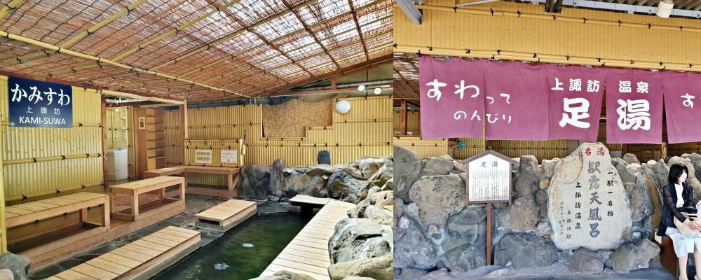 JR Kami-Suwa Station (上諏訪駅) is around 2 hours from JR Shinjuku Station (新宿駅) by the Limited Express Azusa on the Chūо̄ Line, or about 25 minutes from JR Matsumoto Station (松本駅) by the Limited Express Azusa on the Chūо̄ Line. Did you know? Living up to Kamisuwa’s reputation as a hot spring resort, even JR Kami-Suwa Station has a very unique feature: there is a footbath at the station platform, so you can soak your feet while waiting for the train.