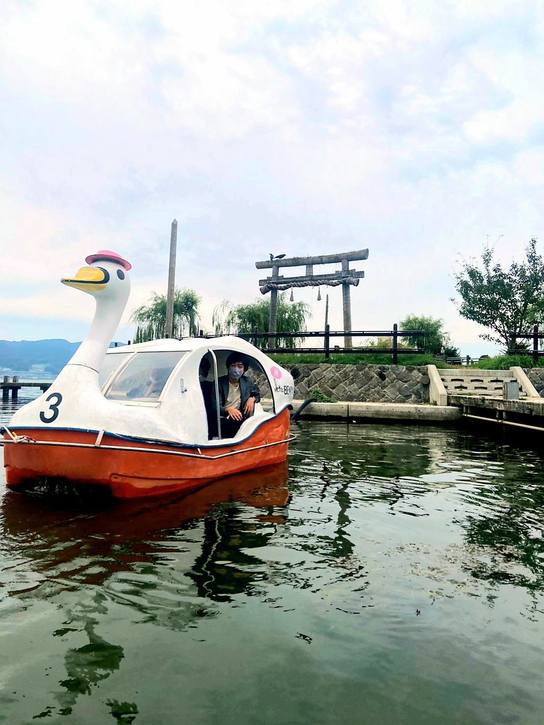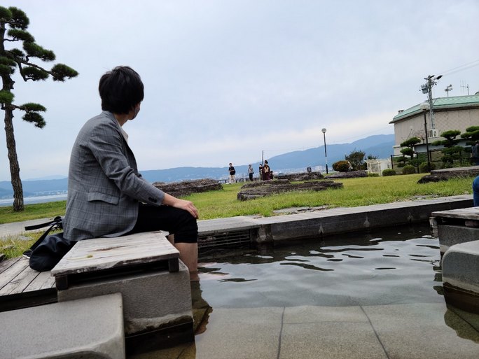After the boat ride, our feet were tired from pedaling the boat, so we soaked our feet in the footbath near the promenade. As mentioned earlier, Suwa is famous as a hot spring resort, and the feeling of enjoying a footbath while looking out over Lake Suwa is exceptional. The footbath here is free, so it was a perfect way to take a break, and we enjoyed chatting while soaking our feet in the hot water.