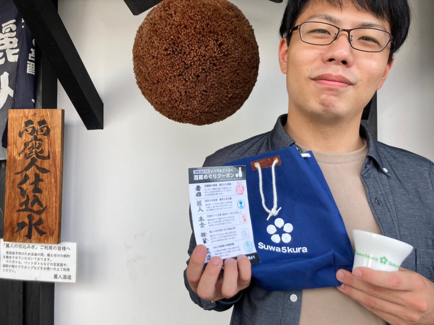 To use it, purchase a ticket at any of the Suwa Gokura stores or at the Suwa City Tourist Information Center next to JR Kami-Suwa Station. When you buy a ticket, you will receive an original handbag and glass, so take this with you when you go around five breweries. It seems that you can also use the glass when drinking alcohol at home. After get a stamp on a ticket, you can enjoy tasting sake. (This time, due to the influence of COVID-19, it was not possible to do sake tasting at all the breweries. Some breweries offer recommended cup sake when tasting is unavailable.)