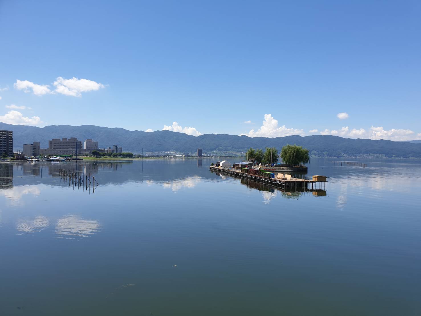 After returning to the city, we headed to Lake Suwa. Lake Suwa is surrounded by a promenade and you can enjoy a walk. Also, you can see a locomotive exhibition beside the promenade and enjoy the free footbath (足湯 ashiyu). For a different view, you can enjoy a leisurely view of the city from the lake on a pedal boat, motor boat, or pleasure boat. In addition, many tourists come to see cherry blossoms in spring, fireworks in summer, and coloured leaves in autumn, and smelt fishing (わかさぎ釣り wakasagi-tsuri) in winter.