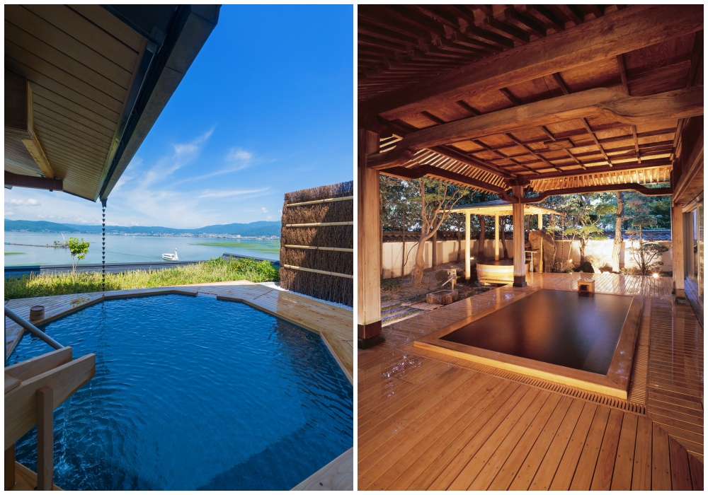 Outdoor hot springs at Kamisuwa Onsen. (Image credit: SUHAKU (left) and Hotel SAGINOYU (right))