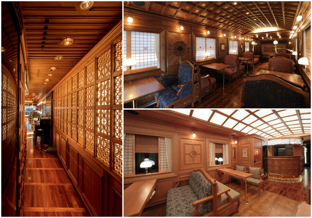 Like the Seven Stars in Kyushu, the interiors of the train’s six cars are a blend of modern Western styles and traditional Japanese styles, with features such as intricate Okawa kumiko latticework designs and shoji screen windows.