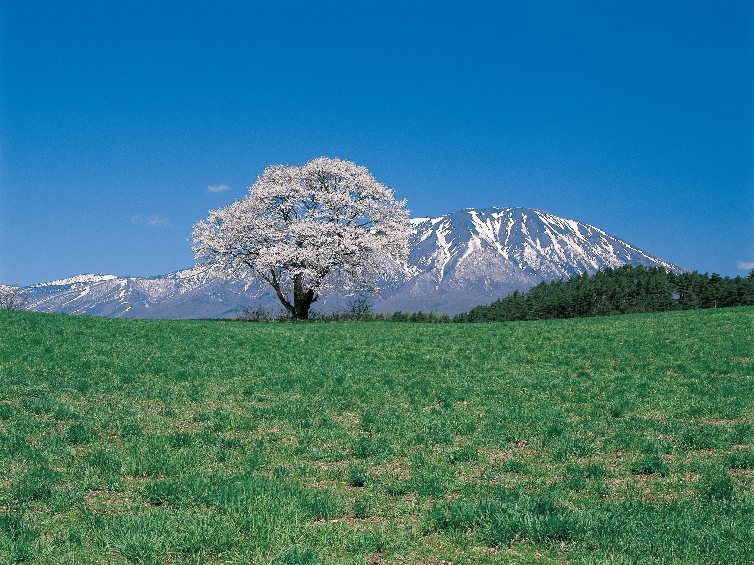 Lone cherry blossom tree and Koiwai Farm. (Image credit: Tohoku Tourism Promotion Organization)