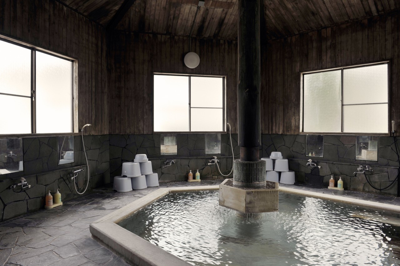 Taenoyu has hot spring baths separated by gender, and the baths are swapped every evening. It also has a gender-mixed open-air bath, which feels like an infinity pool and overlooks a giant waterfall at the edge of the space.