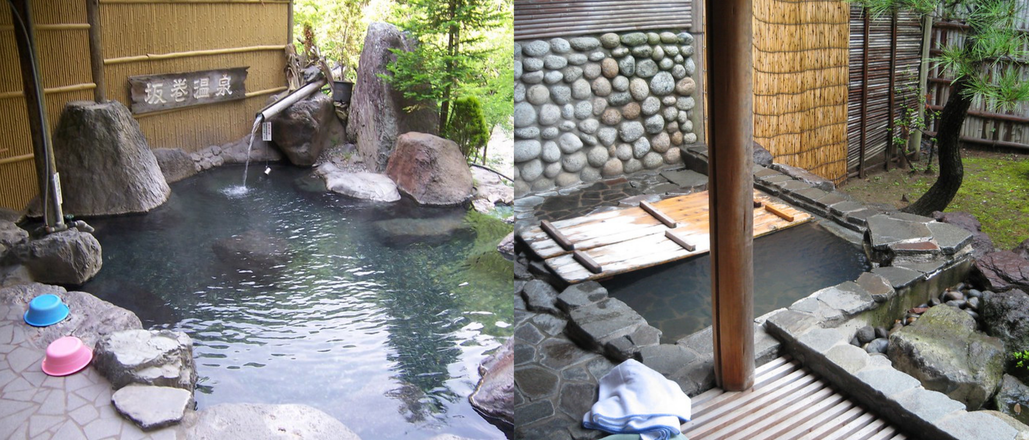Hot springs as a public bath, or private ones attached to rooms in an inn. (Image credit: holycalamity / CC BY 2.0 (left), vera46 / CC BY 2.0 (right))