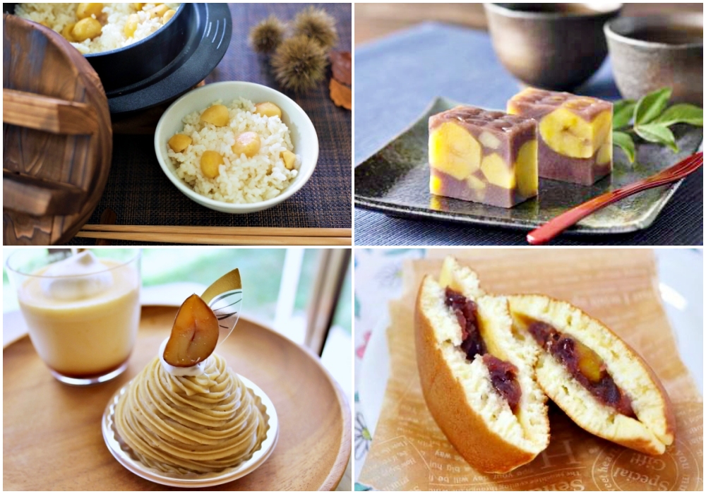 Different ways to enjoy chestnuts. Clockwise from top left: Chestnut rice, chestnut yokan, chestnut dorayaki, mont blanc. (Image credit: photoAC)