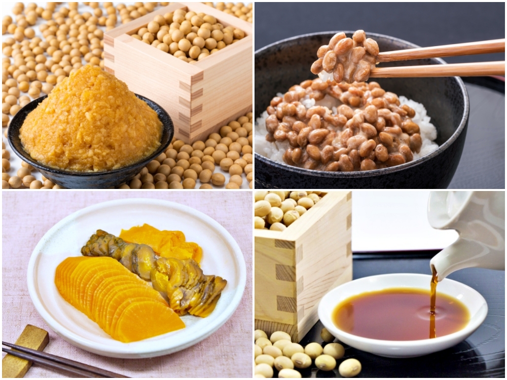 Nagano is the kingdom of fermented foods. Clockwise from top left: miso paste, natto, shoyu, tsukemono. (Image credit: photoAC)