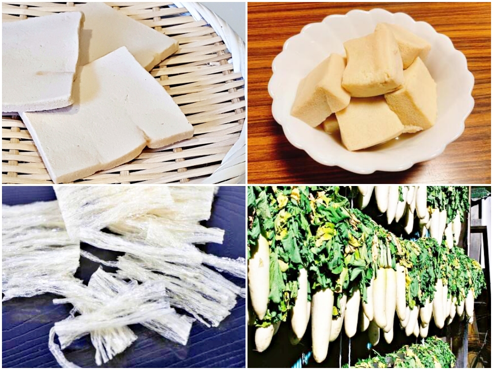 Living in a cold climate, Nagano people found a way to take advantage of their freezing winters to bring drying to another level: freeze-drying. As Nagano’s bitterly cold winters can go below freezing temperatures, local people made use of this to naturally freeze-dry foods and make things like frozen tofu (凍み豆腐 shimi-dо̄fu or 高野豆腐 Kо̄ya-dо̄fu), frozen radish (凍み大根 shimi-daikon), and agar (寒天 kanten).