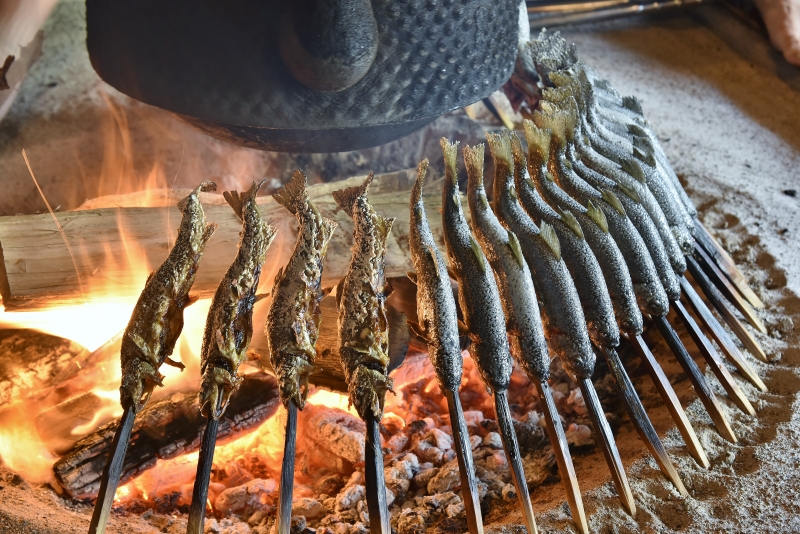Iwana is best enjoyed slow-grilled over a hearth. Unlike larger marine fish, you can eat the entire iwana—head, fins, tail, bones, and all—and it tastes especially great with beer and alcohol!