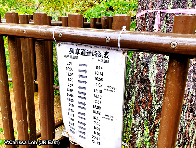 Near the viewing platform outside Narukokyo Resthouse, there is a timetable for when trains will be travelling between Naruko-Onsen Station and Nakayamadaira-Onsen Station. Photographers and railway fans position themselves with a good view of the tunnel, and wait for the train to appear.