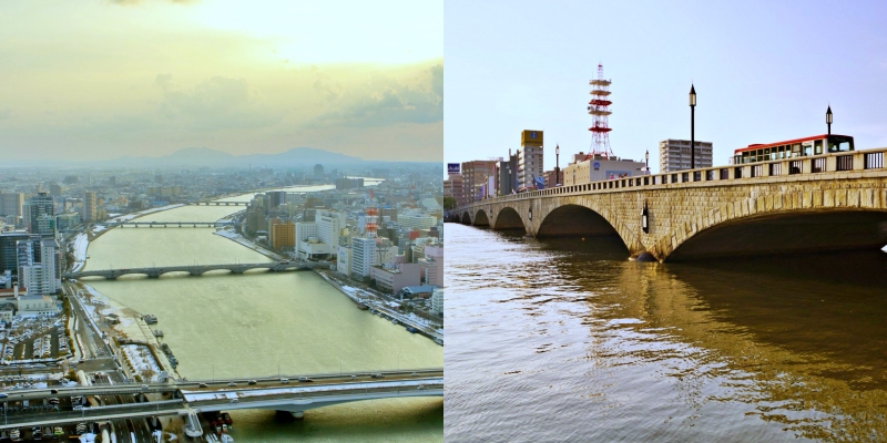 A symbol of Niigata City’s resilience, the Bandai Bridge (萬代橋 Bandai-bashi) spans across the Shinano River, and connects the new, vibrant town of Bandai (万代) in the south with the old, historic town of Furumachi (古町) in the north. The bridge was originally built out of wood in 1886, but was destroyed in a fire in 1908. Although it was rebuilt after the fire, the bridge still fell apart after about 20 years. Finally, in 1929, the current version of the Bandai Bridge was completed, made out of reinforced concrete and surviving a major earthquake in 1964. 2004 marked the 75th anniversary of the bridge, and in commemoration, its name in kanji was reverted back to 萬代橋 (original, older kanji) from 万代橋 (newer, simplified kanji).