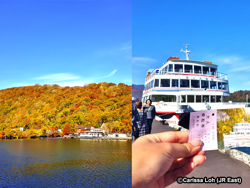 Lake Towada’s autumn colors (left) and sightseeing boat (right). (Image credit: JR East / Carissa Loh)