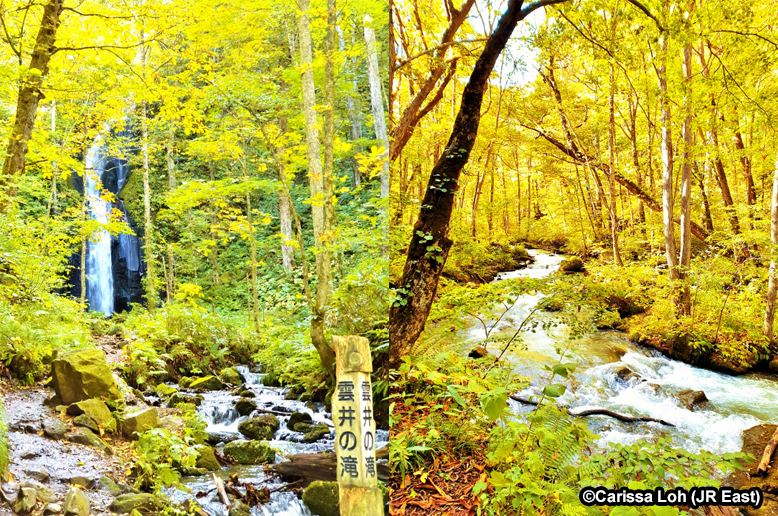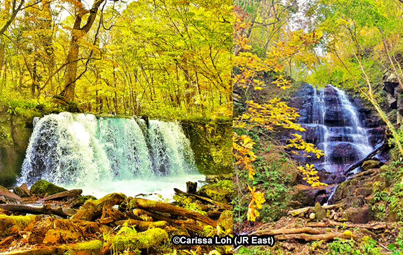 Autumn foliage at Kumoi no Taki Waterfall (left) and Oirase Keiryu stream (right). (Image credit: JR East / Carissa Loh)