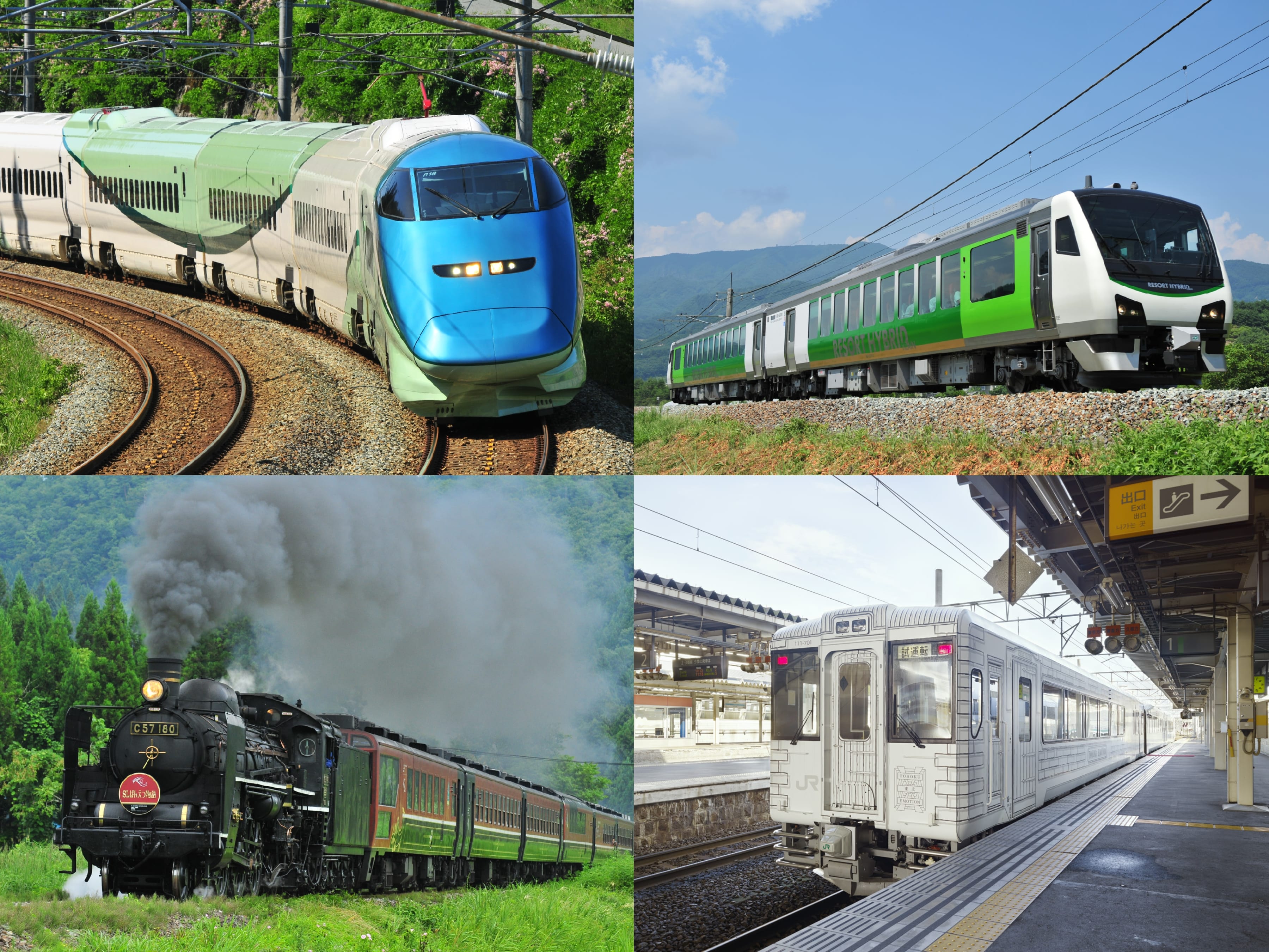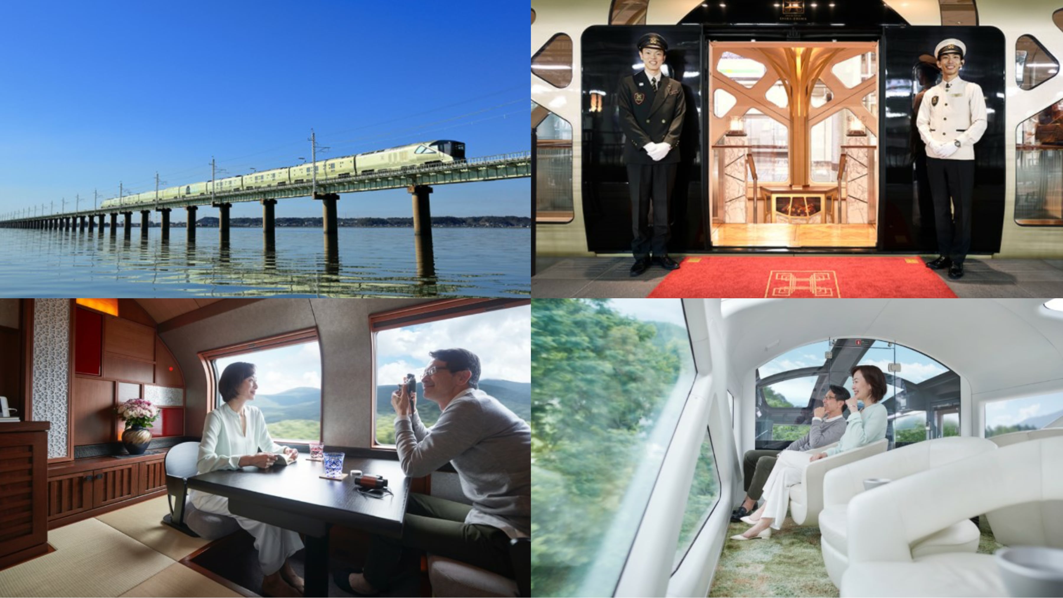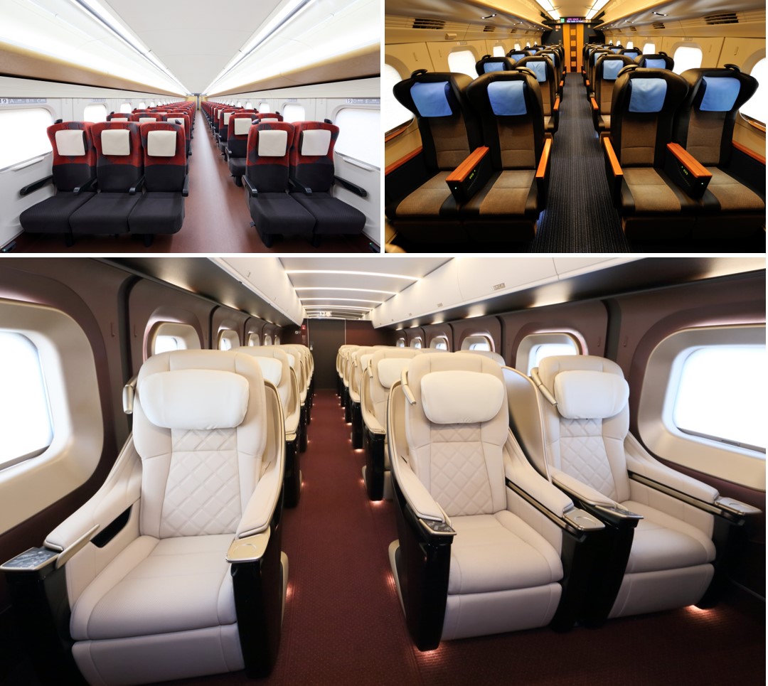 Different car classes on the shinkansen: Ordinary Car (top-left), Green Car (top-right), and Gran Class (bottom). (Image credit: JR East)