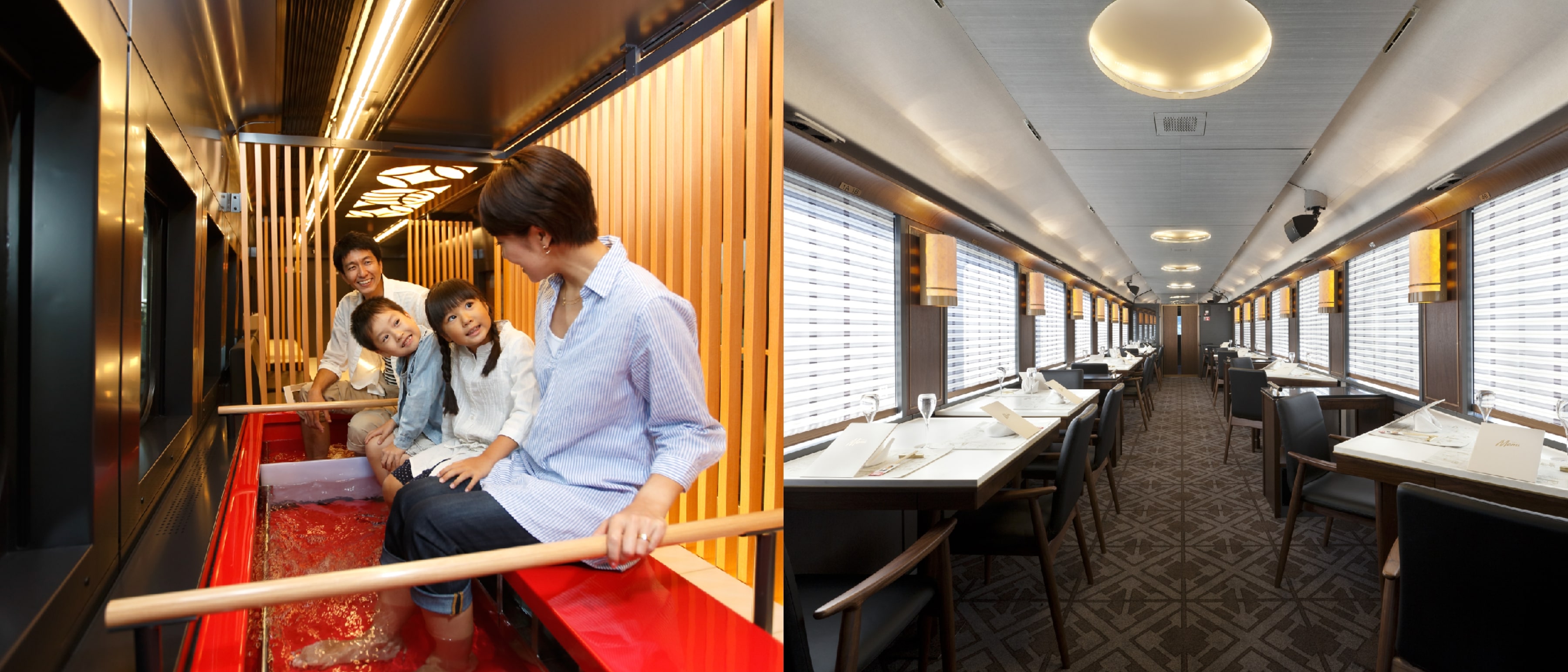 While traversing through rural areas in prefectures in eastern Japan such as Iwate (岩手) and Nagano (長野), passengers on Joyful Trains can experience activities not commonly associated with rail travel. For example, passengers on the Toreiyu Tsubasa can experience footbaths (足湯 ashiyu) right inside the carriage itself, and on TOHOKU EMOTION, passengers can take part in exquisite fine dining while gazing at the sea off the Sanriku coast.