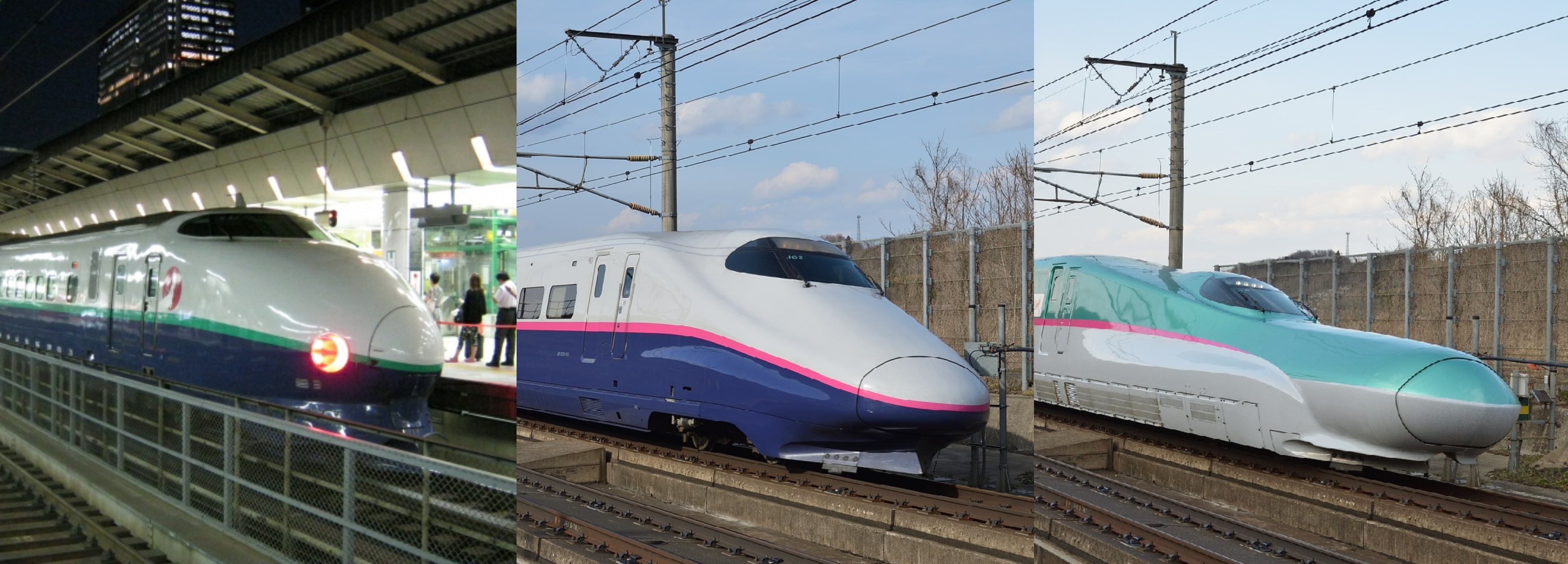 Shinkansen evolution from 200 series (left) to E2 series (middle) and E5 series (right). (Image credit: photoAC (left), JR East / Shinoda (middle and right))