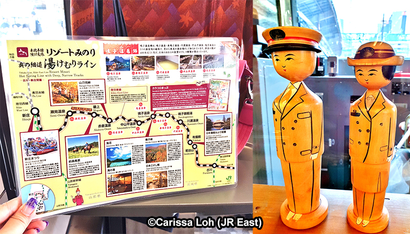 Tucked inside the seat pockets are mini guides providing information on sightseeing spots and hot spring resorts along the Riku-East Line. There are also specially-made kokeshi (こけし traditional wooden dolls) in the shape of train staff!