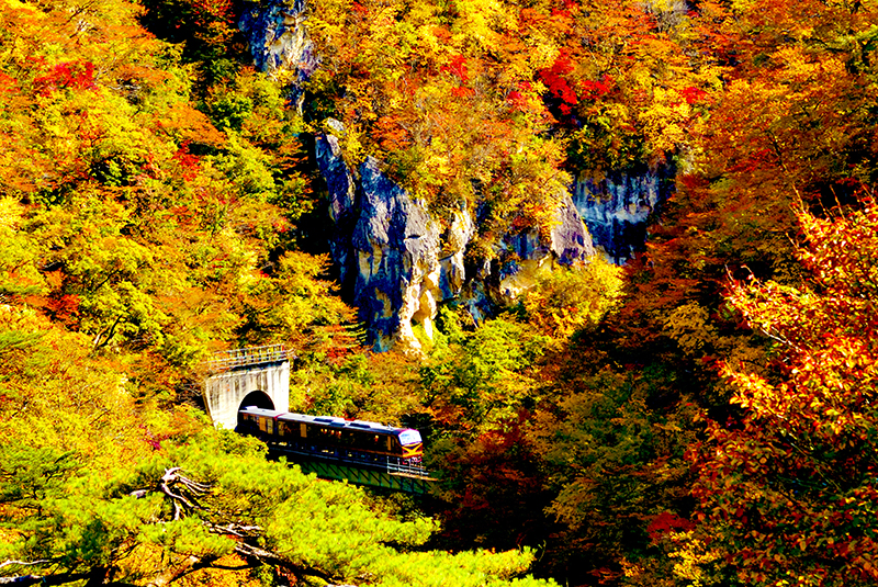 One of the older Joyful Trains, the Resort Minori (リゾートみのり Rizōto Minori) plies the Riku-East Line (陸羽東線) between JR Sendai Station (仙台駅) and JR Shinjō Station (新庄駅), and is best known for the stunning views that you can enjoy from the train's wide windows in autumn, such as golden rice fields and colourful fall leaves. The train passes by one of Tohoku's best autumn foliage viewing spots, Naruko Gorge, as well as a well-known hot spring resort, Naruko Onsen.