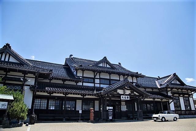 The wooden building was made to resemble Izumo Taisha (出雲大社), one of the oldest and most important Shintō shrines in Japan also located in Shimane Prefecture. It was preserved after train services were discontinued, and designated as an Important Cultural Property in 2004.