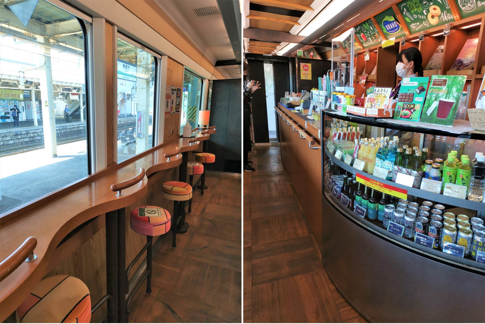 Do you know another great thing about the Resort Shirakami Buna train? There is the sales counter 「Oraho」 in Car 3, where passengers can check out the wide range of ekiben (駅弁 railway lunchboxes), souvenirs, beverages and more that are on sale. I was quite surprised by the wide variety of goods available at the counter, especially the local handicraft and local craft beers.