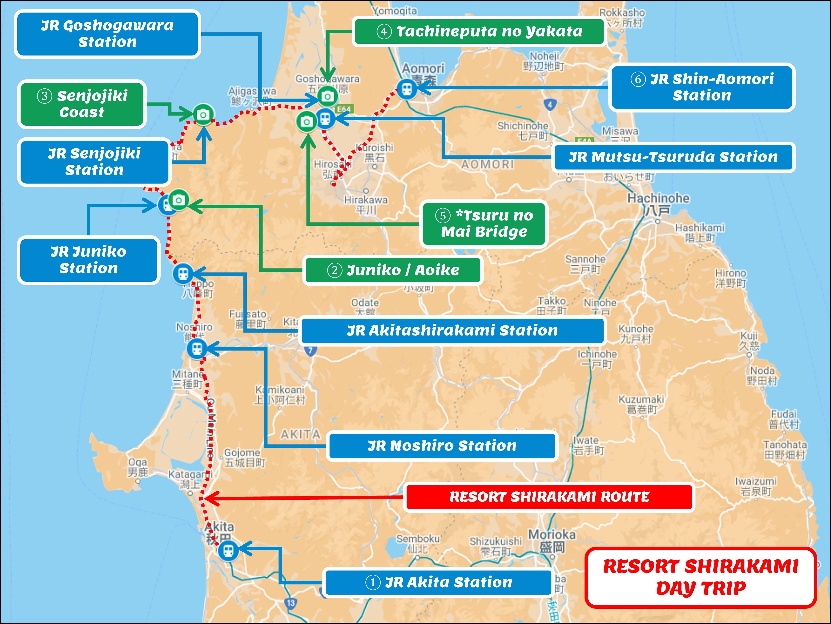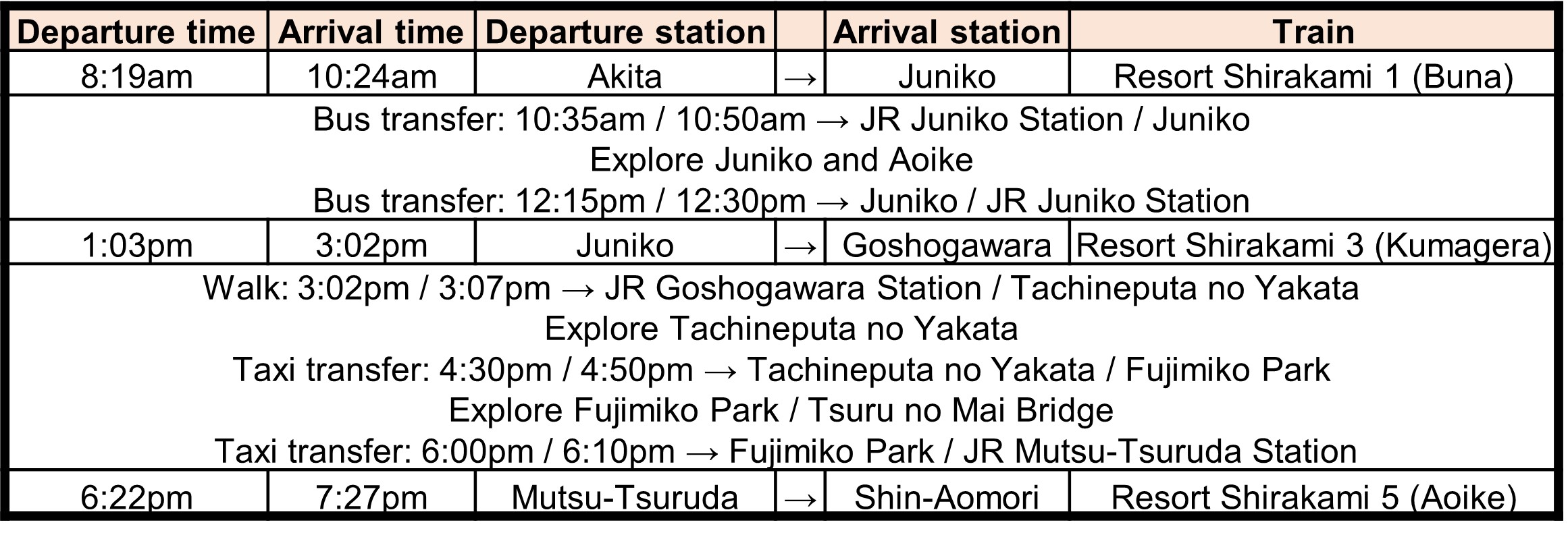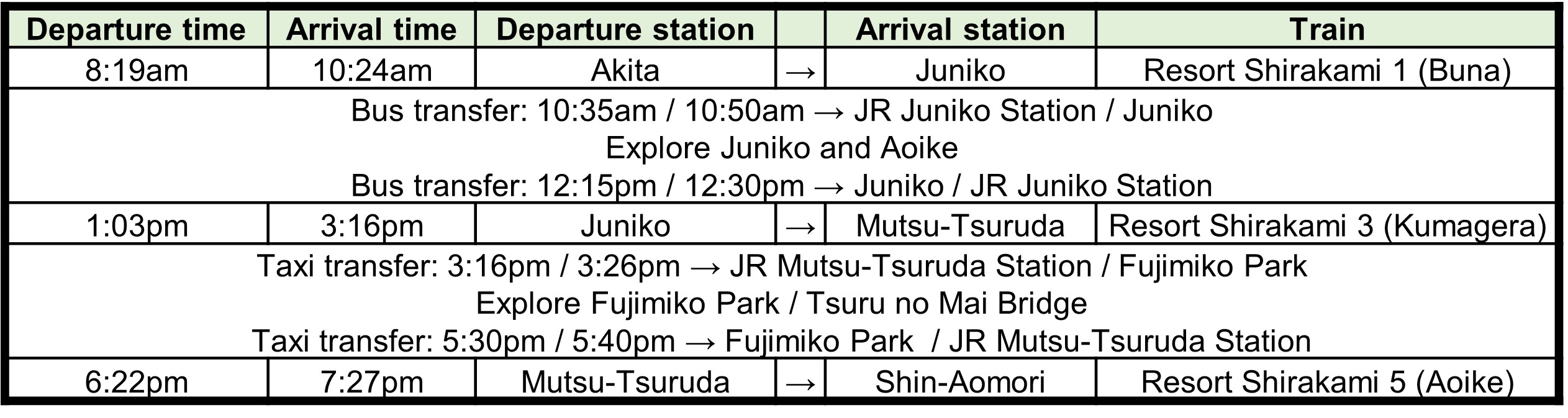 Option B: 3 Resort Shirakami trains + Aoike + Tsuru no Mai Bridge