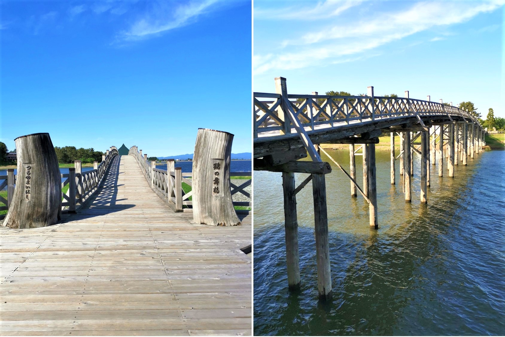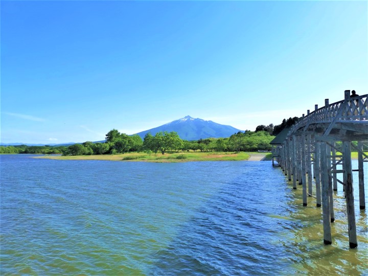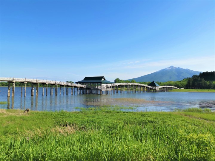 Built in 1994, the Tsuru no Mai Bridge is regarded as the main landmark of the town and is also the longest triple-arched wooden bridge in Japan. I was completely taken aback by the sheer beauty and elegance of the bridge, and even more captivating is the surrounding scenery, especially with Mount Iwaki (岩木山 Iwaki-san) in the background. The weather was superbly clear when I came to see the bridge, and I could see the mountain in the far distance, making my visit completely worthwhile and memorable.