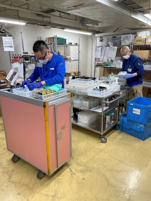 The Gran Class Cleaning Room, located in Tokyo Station and with similar bases in Shin-Aomori, Morioka, and Kanazawa, is where much of the preparation work takes place. After a shinkansen returns, the glassware and cutlery used are taken there to be washed and cleaned, while other workers load the carts with drinks to be served aboard, and yet others are tasked with preparing the food and amenities to be given out to passengers.