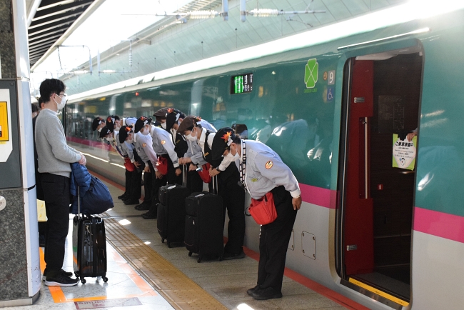 The cleaning staffs bowing after finishing their duties. (Image credit: East Japan Railway Company)