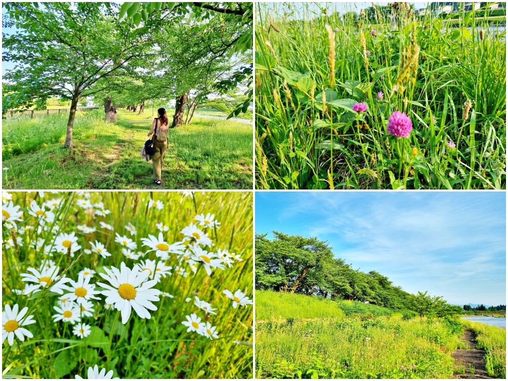 Although there were no sakura flowers during this period, there were other white, pink, and yellow flowers in bloom, and with the bright blue sky above, the riverside scenery was both relaxing and gorgeous.