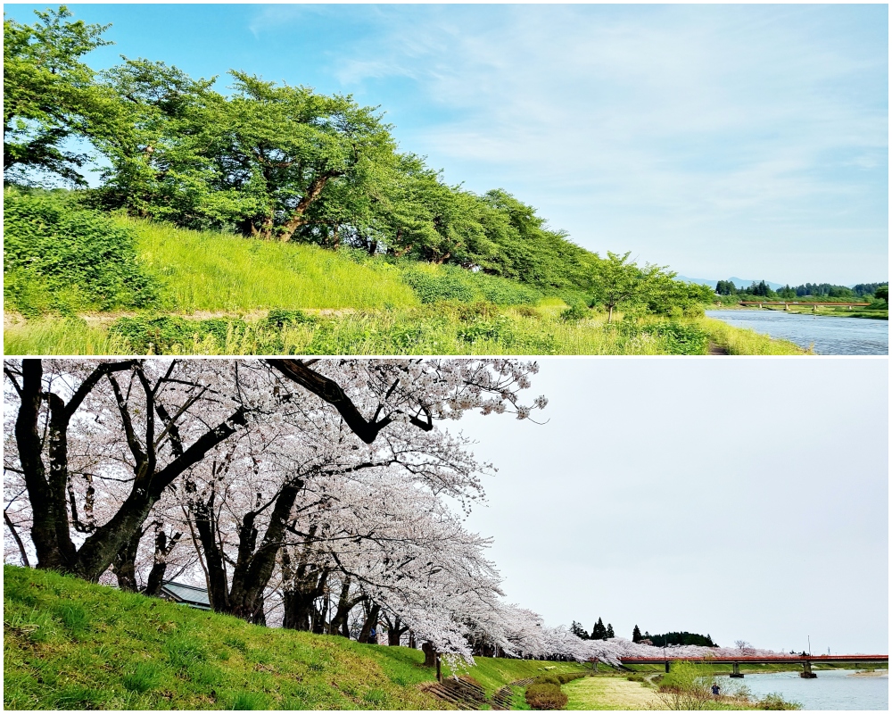 Sakura trees along the banks of the Hinokinai River during shinryoku season (top) and sakura season (bottom). (Image credit: JR East / Carissa Loh)
