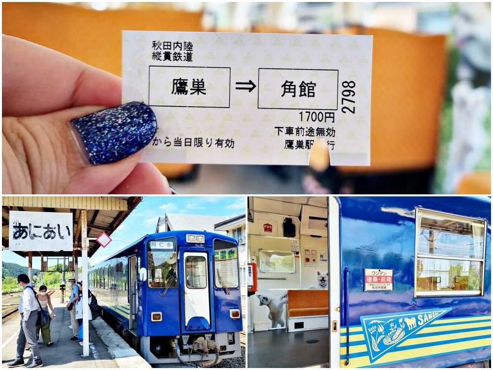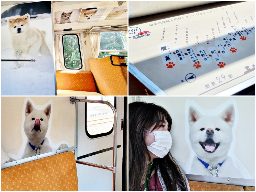 Akita is also famous for Akita Inu (秋田犬), a large and loyal breed of dog, and I was so excited and delighted to see that the inside of the train had dog motifs on the seat cover fabric, as well as photos of Akita Inu on the train walls and ceiling.