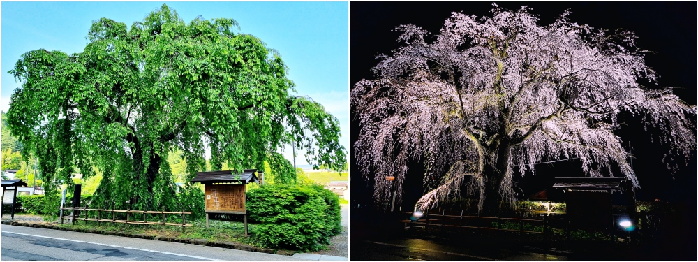 Sakura tree during shinryoku season (left) and sakura season (right). (Image credit: JR East / Carissa Loh)