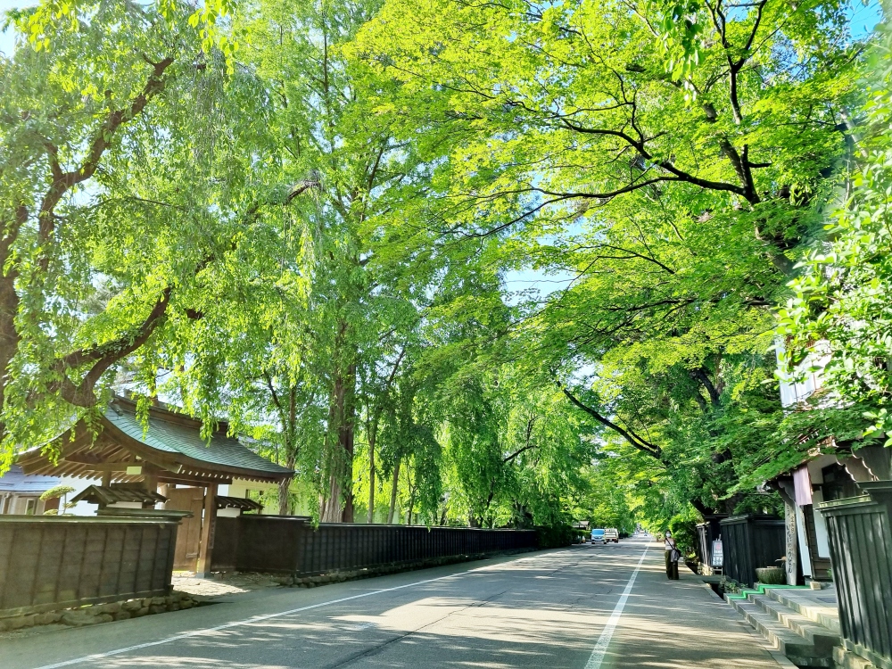 Located in Semboku City (仙北市 Senboku-shi) in Akita Prefecture (秋田県), Kakunodate is most known for its enchanting scenery during spring, when hundreds of dramatic shidarezakura  (しだれ桜 weeping cherry blossoms) bloom, turning the sides of the street pink. However, did you know that during the shinryoku (新緑 fresh greens) season, the cherry blossom trees sprout bright and beautiful green leaves, bringing liveliness to the street? This green is very different from the typical green leaves you see in Singapore and Southeast Asia; it's an unbelievably bright green, brimming with life and vitality.