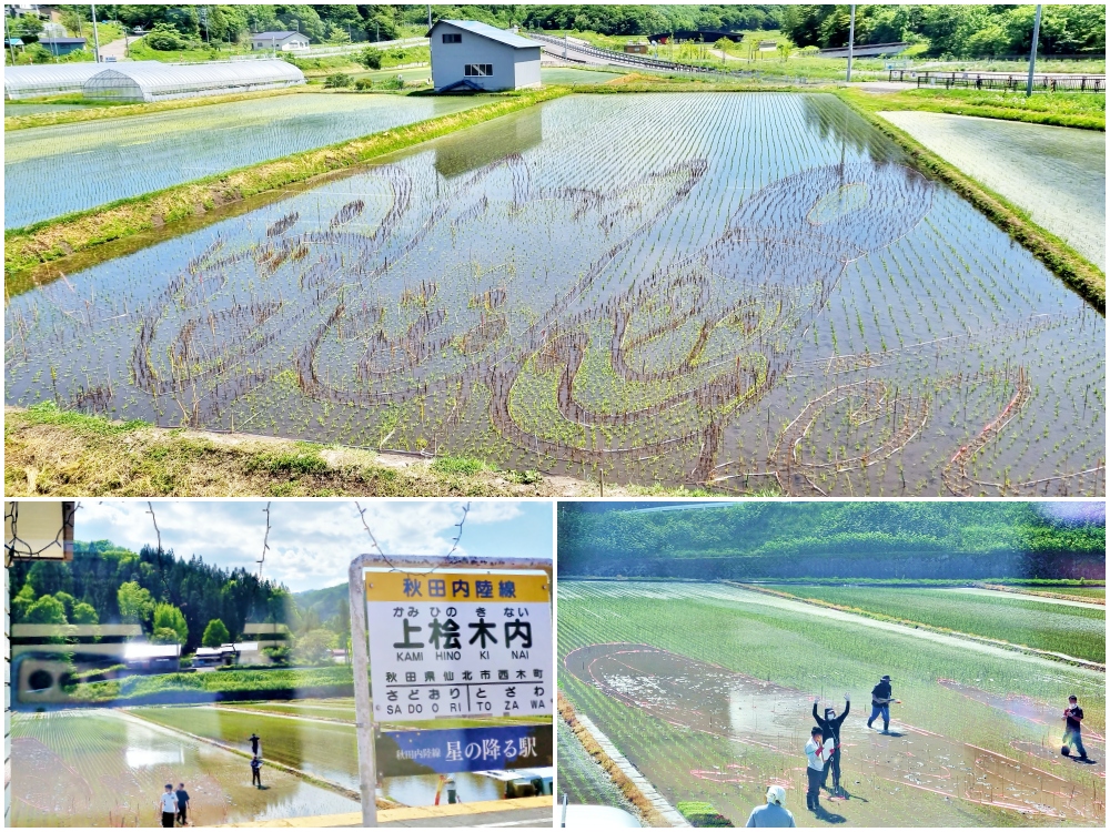One thing that the Akita Nairiku Line is famous for is the sight of tanbo art (田んぼアート rice paddy art) that passengers can see while riding the train. Tanbo art is where different-coloured rice are planted to create images on the field. The best time to see the images is in September, but shinryoku season is when the rice is planted.