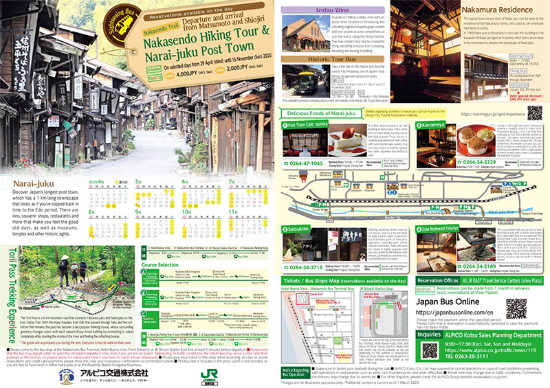 There is a special bus tour departing from Matsumoto Station or Shiojiri Station that will take you to some the places that I shared in this article. Please choose a tour (Tour 1: Walking in Naraijuku: the Nakasendo and Kisoji Routes; Tours 2, 3: Trekking the Torii Pass) and make a reservation online, or you can buy same day ticket if there are vacant seats. For more information, visit this page.