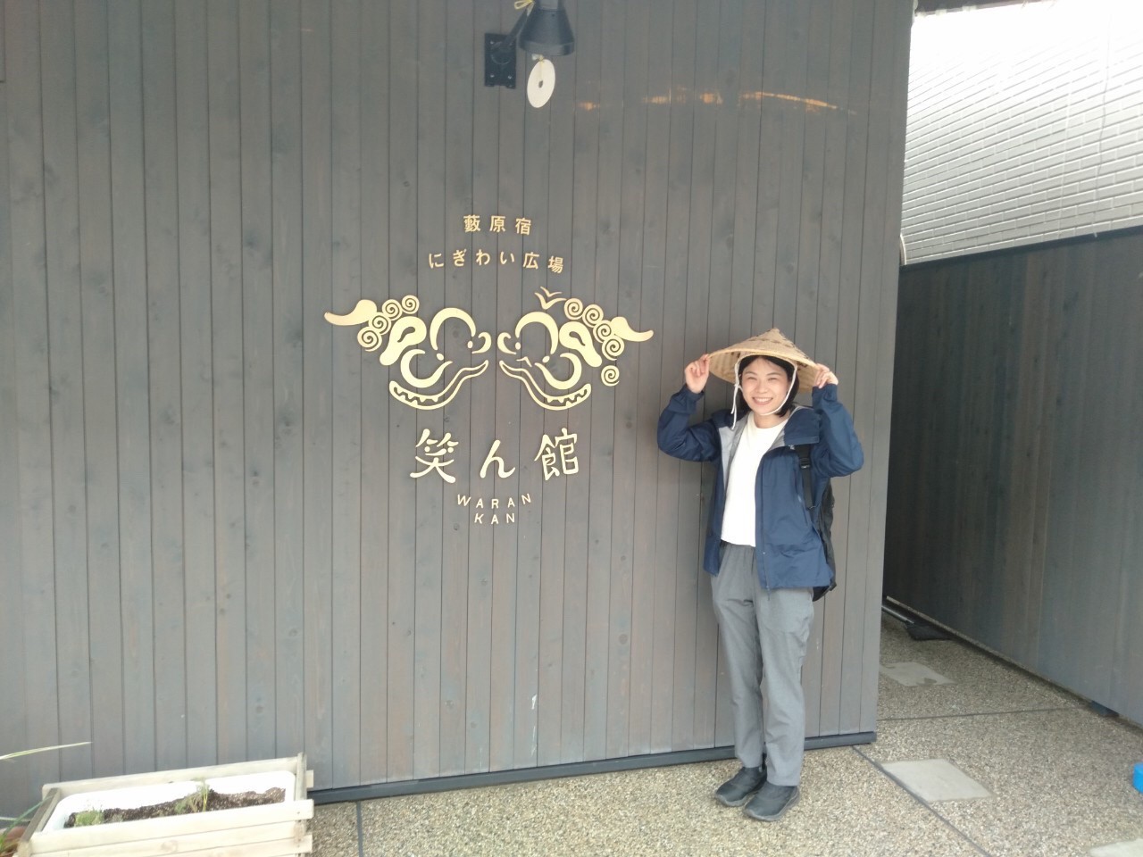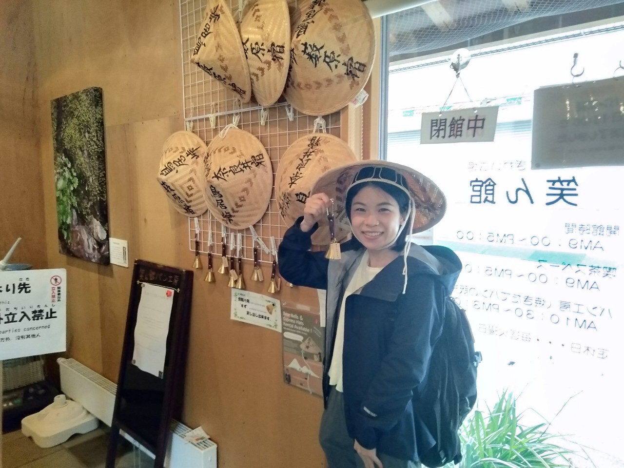 ② Go under the railroad track to reach Yabuharajuku. I saw some nice buildings along the way, and stopped by for a visit. They lent us bear-repelling bells and cypress hats (桧笠 hinoki gasa), which could be used to block the rain or as a sunshade.
