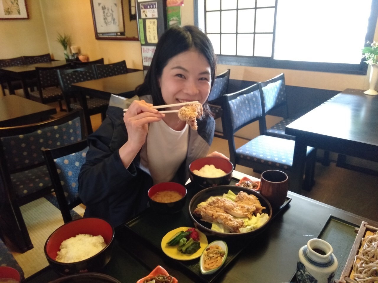 Enjoying sanzokuyaki for lunch. (Image credit: JR East / Chie Matsubara)