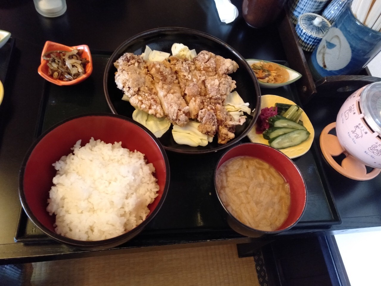 I ordered the sanzokuyaku teishoku (山賊焼定食 sanzokuyaki set meal). After it arrived, my impressions was “This is so Sanzokuyaki!” The outside was crispy, and the inside was really soaked in soy sauce.