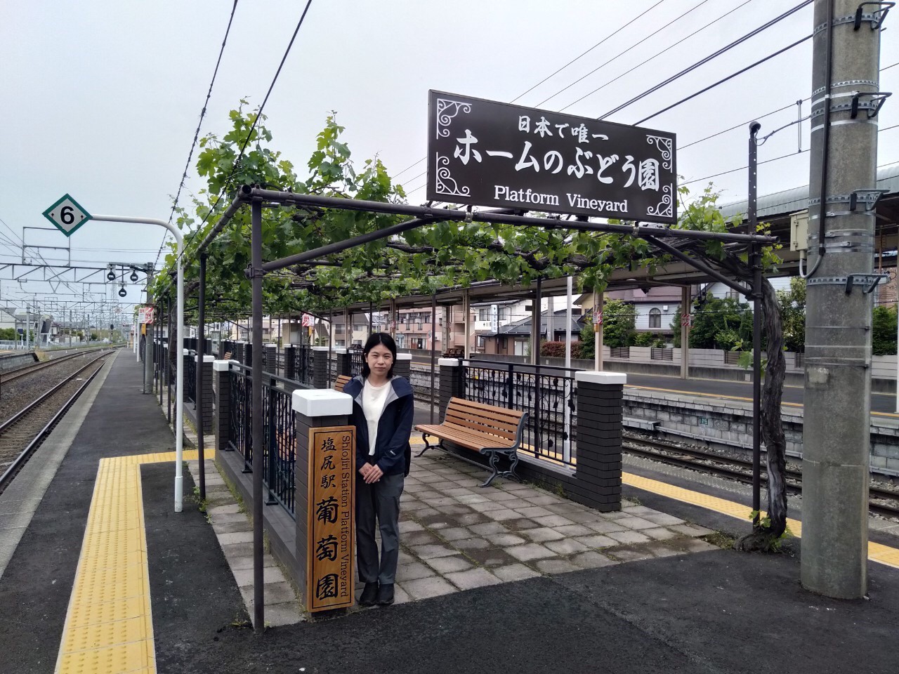 Don’t you think that Shiojiri Station, where they have a vineyard, is so cool? Usually, people enjoy taking photos of trains and the station name board at platforms. At Shiojiri Station, you can take a photo like this too.