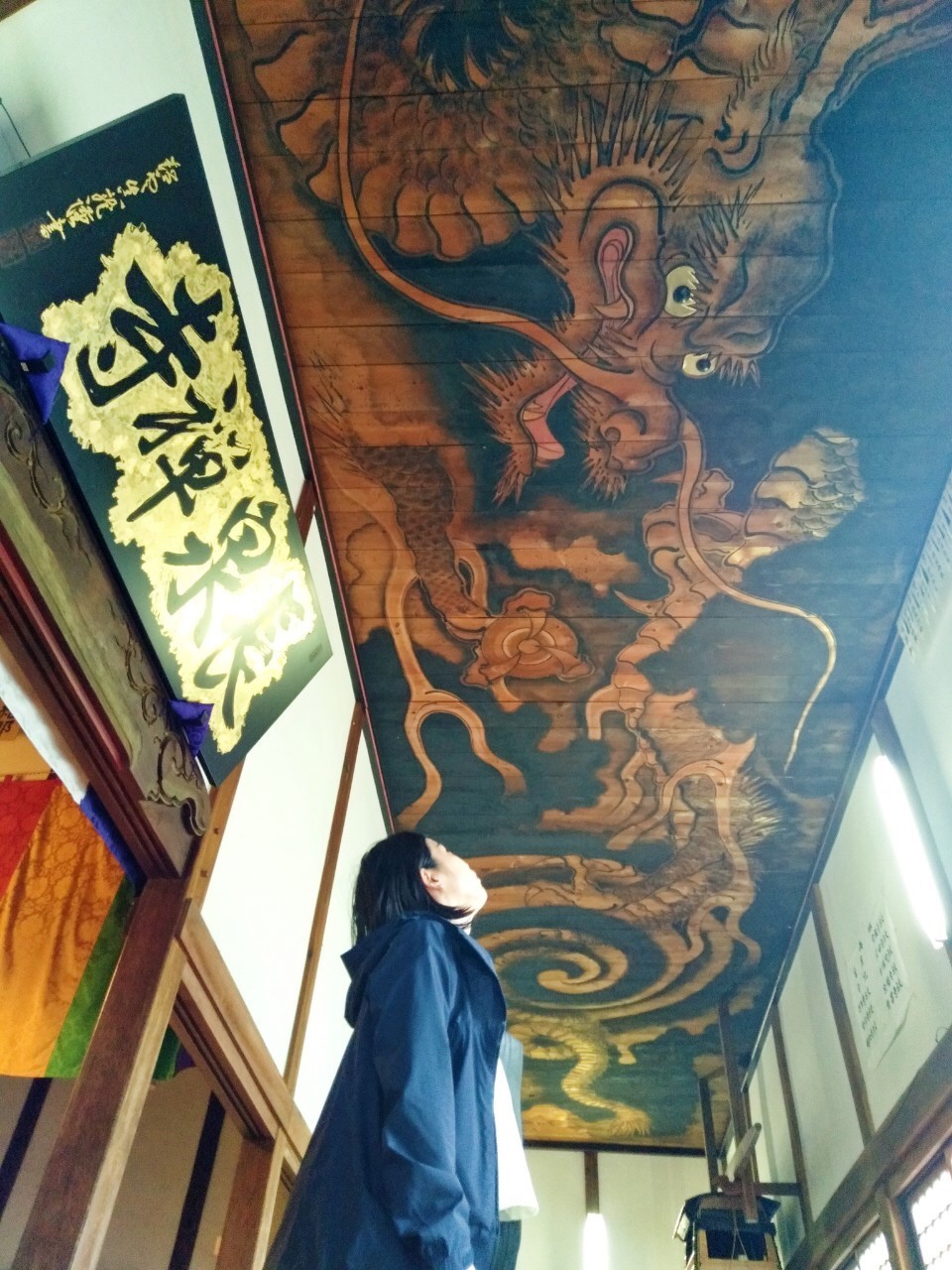 There were many temples at Naraijuku. As soon as I entered to the Hondō (本堂 main hall), a huge painting of a dragon on the ceiling caught my eyes. It was painted in the Meiji Era (1868–1912). The dragon’s eyes were painted with a special process, which makes it look as if it is drawing me in. Before, there used to be special sound made when you clapped your hands under the dragon, but because of deterioration we can’t hear the sound anymore.