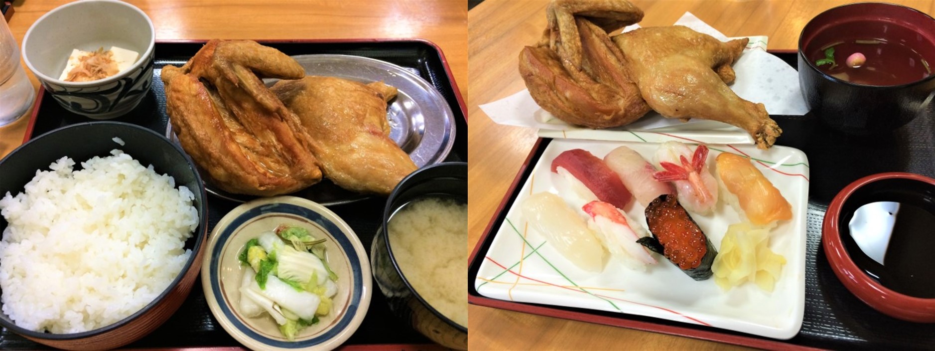 Naruto’s young chicken set meal (left) and sushi (right). (Image credit: Hokkaido Railway Company)