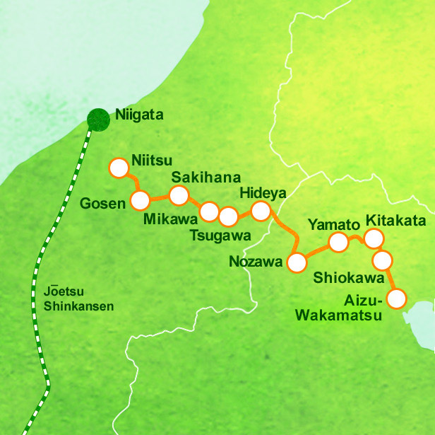 JR Niitsu Station is a 20-minute ride from JR Niigata Station (新潟駅) on the JR Shin-etsu Main Line (信越本線), which is about 2 hours by bullet train from Tokyo. If you prefer to start on the other end, JR Aizu-Wakamatsu Station is a 65-minute ride on the JR Ban-etsu West Line from JR Kōriyama Station (郡山駅), which is 80 minutes by bullet train from Tokyo.