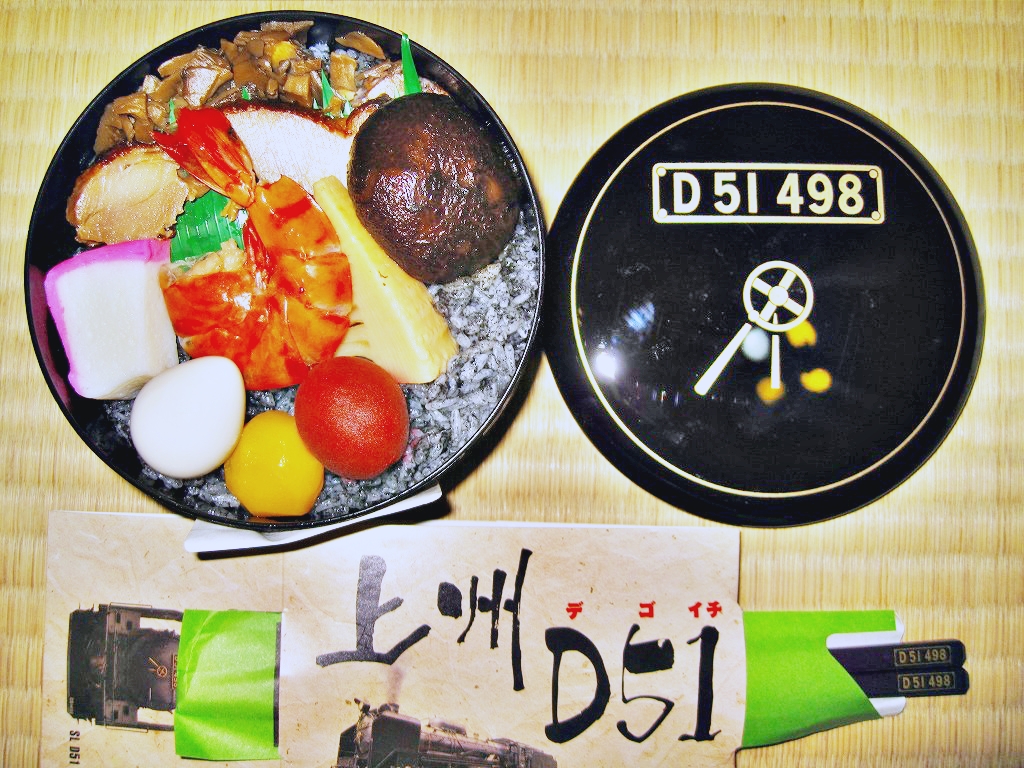There are two types of special SL ekiben, modelled after the two SL trains, and you can keep the box and chopsticks as souvenirs! The Joshu D51 (上州 D51) ekiben has bamboo charcoal rice to resemble the coal needed to fuel an SL train, while the SL Rokuichi Monogatari (SLロクイチ物語) ekiben features a spicy bibimbap to represent the power and heat of an SL train.