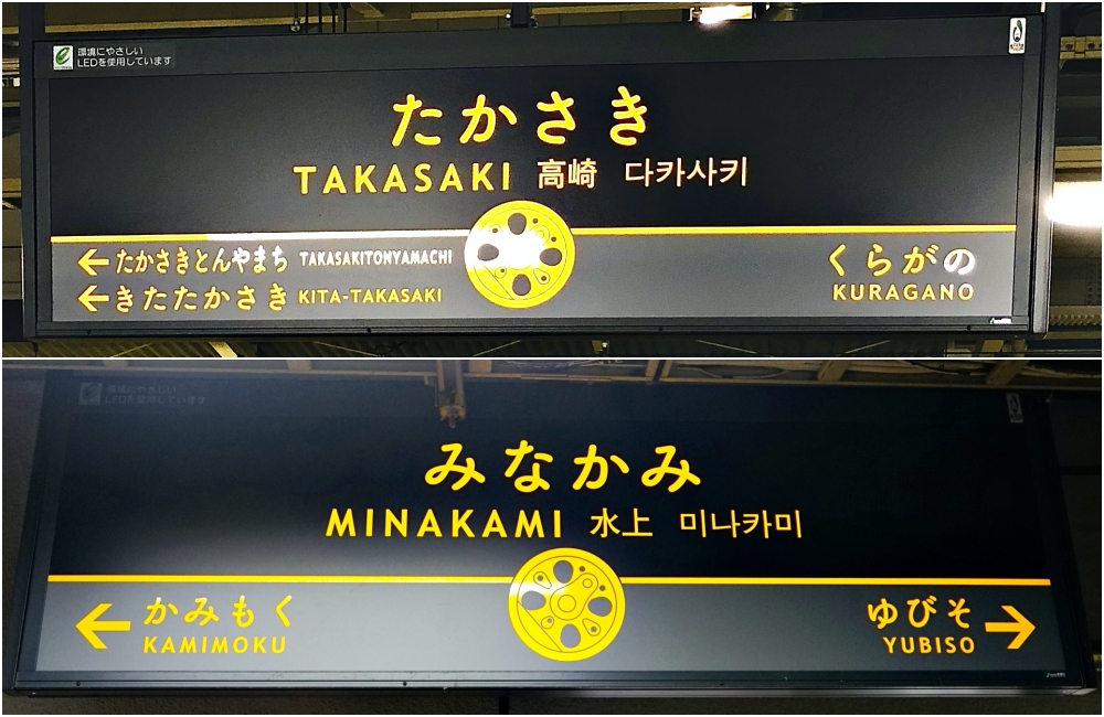 Stations that the SL Gunma passes by have special station signboards, like this at Takasaki Station and Minakami Station. (Image credit: photoAC)